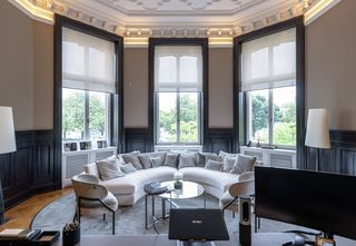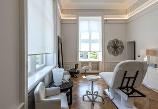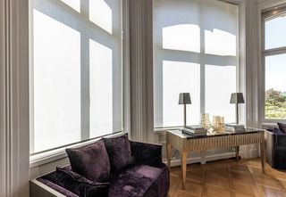 Une centaine de stores enrouleurs motorisés SG 4960 sont installés dans la villa classée. Les cadres des fenêtres ont été adaptés pour minimiser les espaces lumineux latéraux et pour dissimuler les barres inférieures lorsque les stores sont relevés. Plus de 70 systèmes de tringles à rideaux sont installés derrière des fascias sur mesure qui se fondent dans le plafond en stuc. Des rideaux transparents diffusent doucement la lumière du jour, tandis que des rideaux plus épais assurent l’intimité.